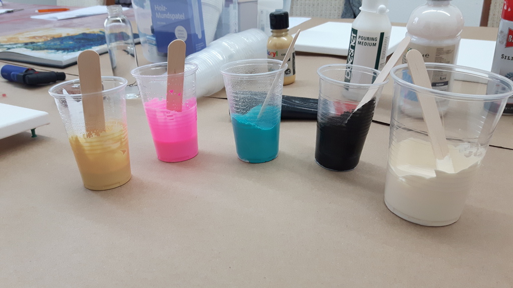 Wir vermitteln Infos, Tipps und Anregungen sowohl zu den Grundlagen dieser Technik aus auch zu den verschiedenen Anwendungsmöglicheiten. Wir starten mit einem "Dirty Cup" auf einer Leinwand 24 x 30 cm und experimentieren dann nach einer leinen Kaffeepause weiter auf drei kleinformatigen Leinwänden (15 x 15 cm).